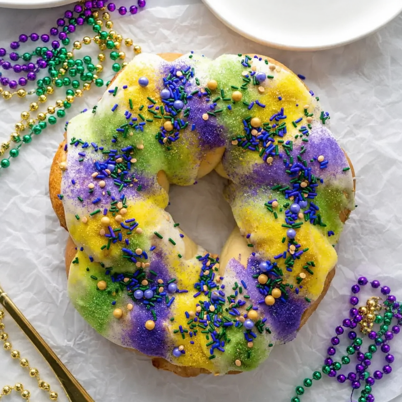 The vibrant topping transforms the cake into a true Mardi Gras centerpiece.