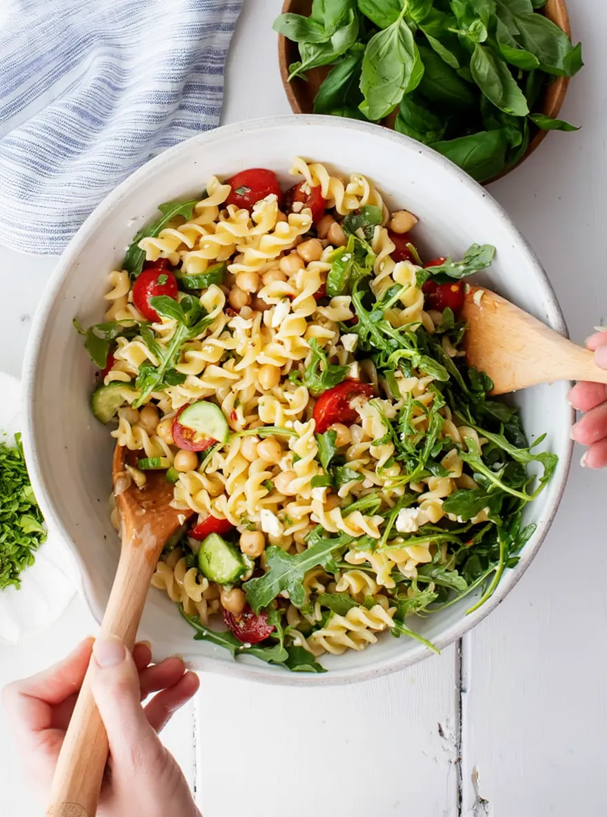 Start by adding 2 heaping cups of halved cherry tomatoes, 1 cup of thinly sliced Persian cucumbers, and 2 cups of fresh arugula to the cooled pasta. Then sprinkle in the fresh herbs: 1 cup torn basil leaves, ½ cup minced parsley, and ½ cup chopped mint. These herbs give the salad an aromatic, refreshing flavor that makes every bite bright and lively.