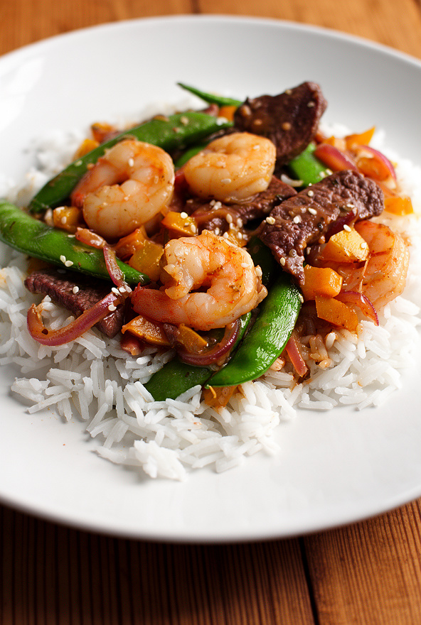 I serve this easy steak and shrimp recipe over a bed of warm cooked rice. The rice absorbs all the delicious pan juices, making every forkful flavorful.