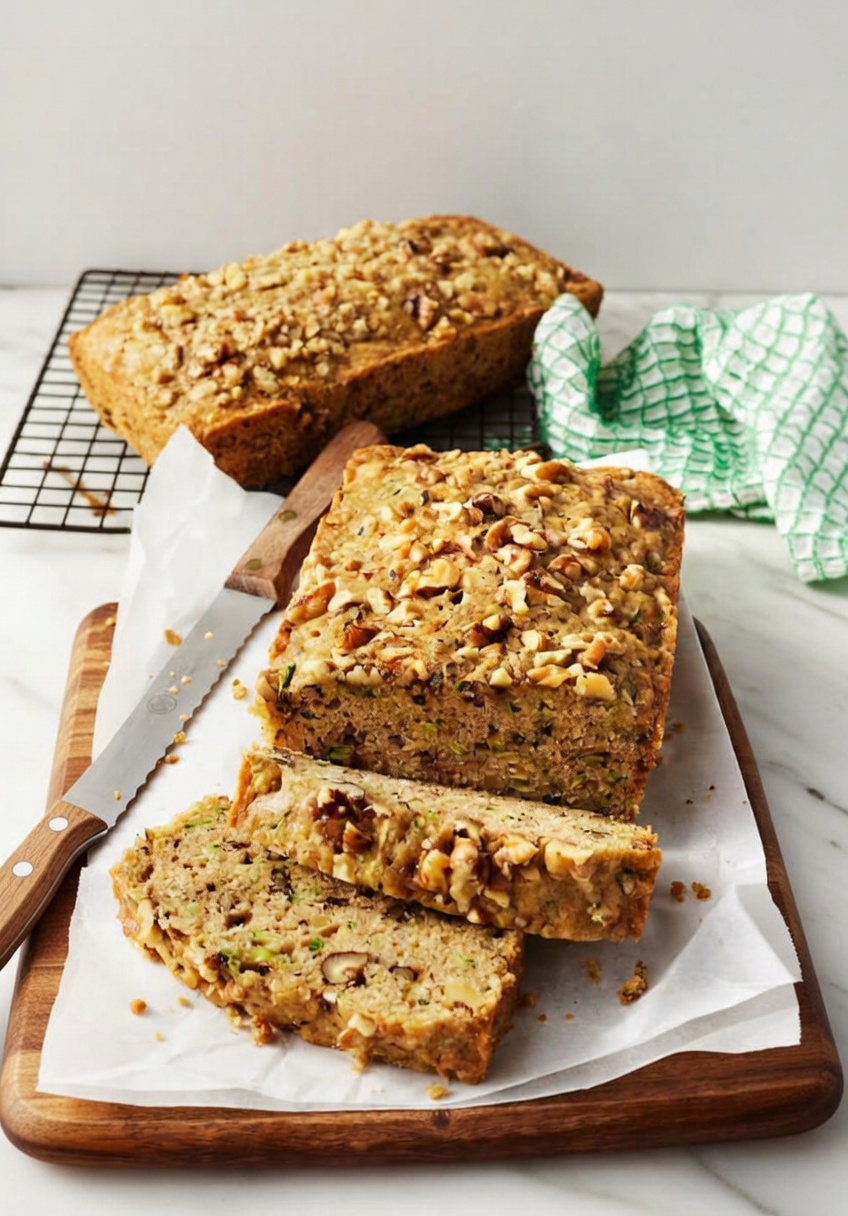 Cut thick slices, and you’ll see the tender, moist crumb studded with green flecks of zucchini and crunchy walnuts — absolutely irresistible.